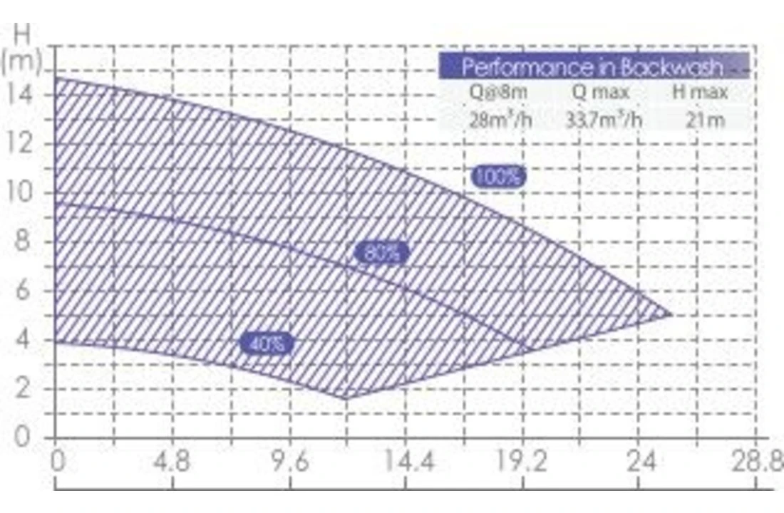 Eén van de unieke eigenschappen van deze pomp is de Backwash functie. “Normale” VSP pompen zijn instelbaar van ±40-100% waarbij 100% tevens de backwash snelheid is. Bij deze pomp is 100% bedrijfssnelheid lager dan de (maximale) Backwash snelheid. De pomp gaat dus tijdens de backwash tijdelijk naar ±140% snelheid. Deze Backwash functie is met 1 duk op de knop op te roepen en duurt standaard 180 seconden maar is aan te passen van 30 tot 900 seconden. Na de Backwash gaat de pomp weer automatisch terug naar de ingestelde bedrijfssnelheid.